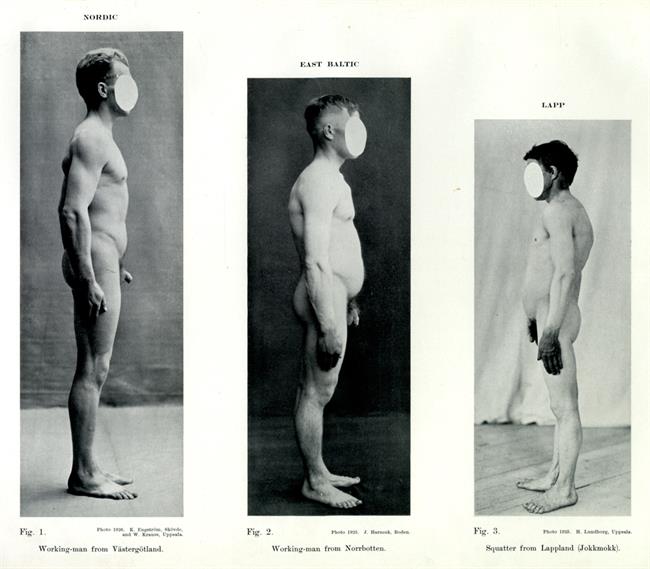 När det gäller själva fotografierna präglas den bildmässiga retoriken av samma rasmässiga systematik. Den långa välväxta nordbon placeras, i fallande ordning, mot de förvisso ljusa men korta och satta östbalterna, till de mörkare och kortväxta lapparna (bild 3). Längst ner i hierarkin placeras blandtyperna, inte sällan definierade som både socialt lågt stående och kriminella.